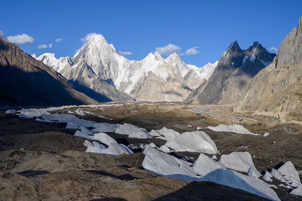 The hike to Urdukas Camp takes us further up the Baltoro Glacier. Urdukas is perched high above the ice and offers one of the trek’s most impressive panoramas — granite spires of Trango, Cathedral Peaks, and Uli Biaho, with Gasherbrum IV visible in clear weather. This shorter trekking day allows time to soak in the mountain scenery.